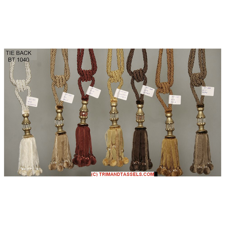 Trim and Tassels has been selling beautiful hand made curtain tiebacks for decades. These curtain tiebacks add just the right amount of decor to your window treatment. They are made of rayon and available in various colors. Click on the drop down list to view list of available colors. For any questions please call us at 1800-477-3459 or 973-808-1566. This is a clearance item. All clearance items are final sale. No returns / exchanges.Clearance - Curtain Tie Backs - BT1040
