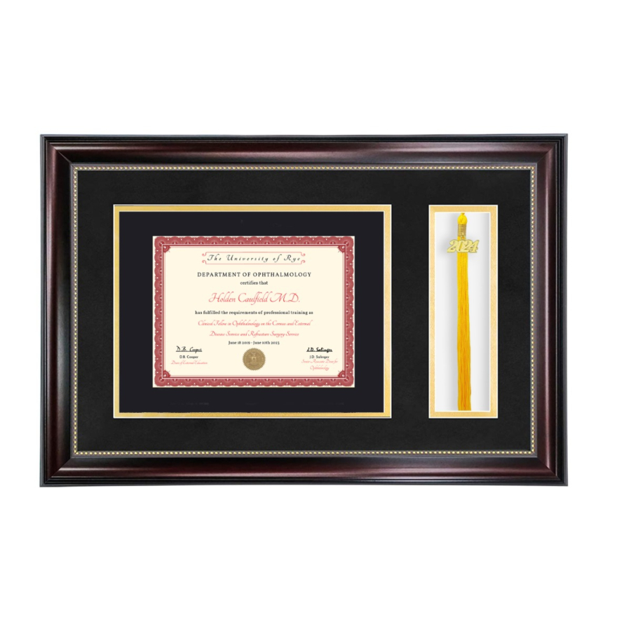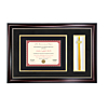 Diploma Size: Fits 8.5" x 11" or 6" x 8" diplomas with black over gold double matting.
