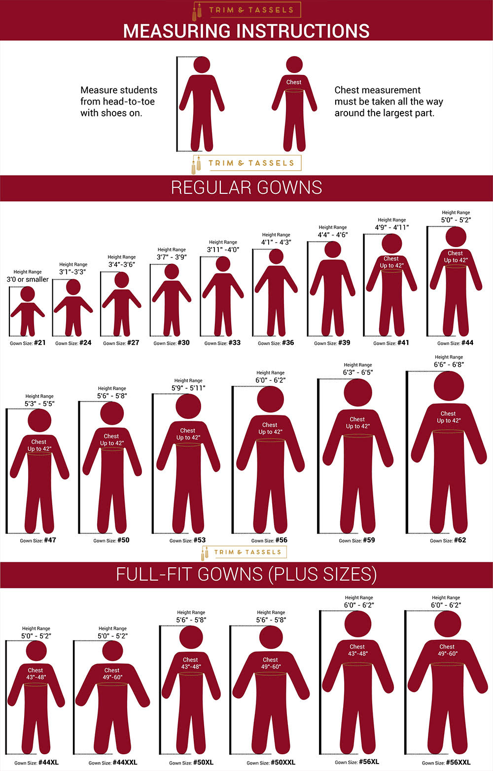 Gown Measurements: Measure student from Head-to-Toe with shoes on. Gowns are already tailored to reach below the knee to calf length, not to the ground. Measure chest all the way around at the largest part. Do not include your arms.